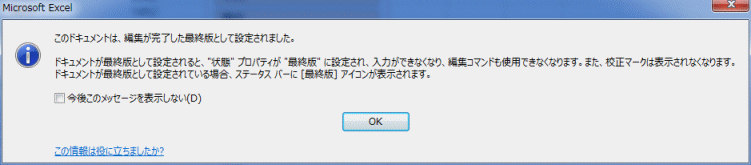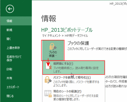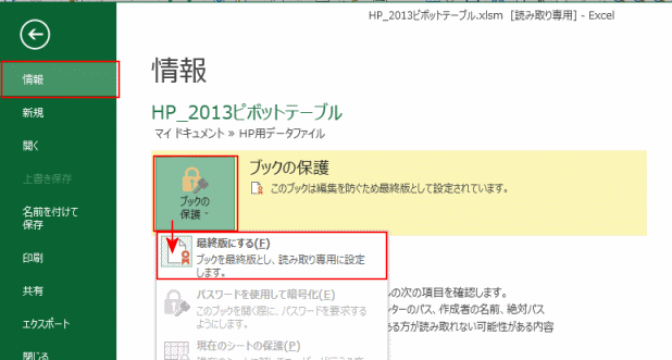 - [最終版にする]と、ファイル(ブック)は読み取り専用になって、内容を変更することができなくなります。