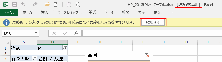 - 最終版であることを示すメッセージが表示されます。[編集する]ボタンをクリックすると「読み取り専用」は解除されます。