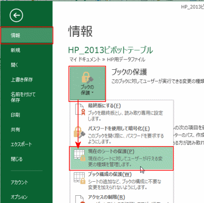 [情報]タブを選択して、[ブックの保護]→[現在のシートの保護]を実行します。