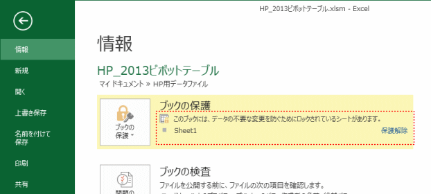 - 情報タブのブックの保護を見ると、Sheet1(設定したシート名)がロックされていると表示されます。
