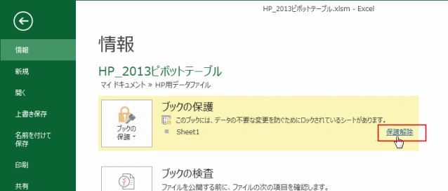 [情報]タブを選択して、[ブックの保護]の右側に表示されている[保護の解除]をクリックします。