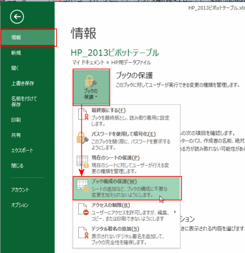 [情報]タブを選択して、[ブックの保護]→[ブック構成の保護]を実行します。