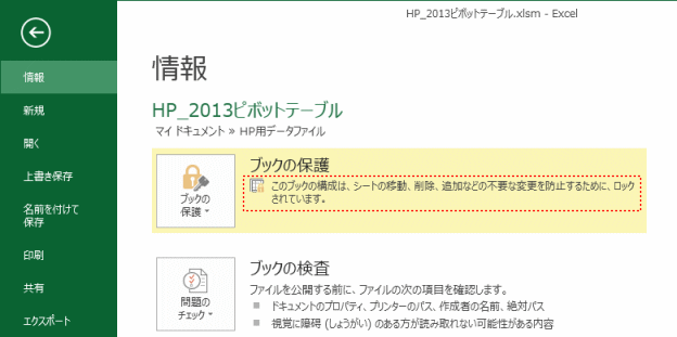 - 情報タブのブックの保護を見ると、ブックの構成が防止され、ロックされていると表示されます。