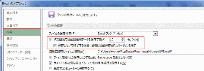 - 「次の間隔で自動回復用データを保存する」にチェックを入れます。