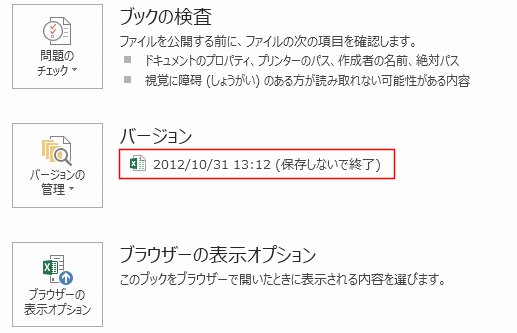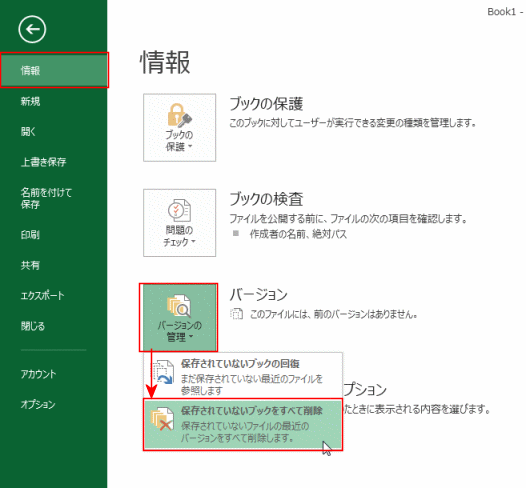 - [バージョンの管理]→[保存されていないブックをすべて削除]を実行します。