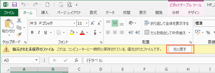 「復元された未保存のファイル・・・」とメッセージが表示されます。