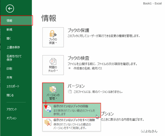 - [バージョンの管理]→[保存されていないブックの回復]を実行します。
