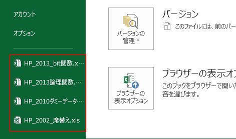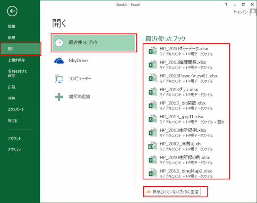 - 最近使用したブックをバックステージビューの下方に表示することができます。