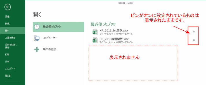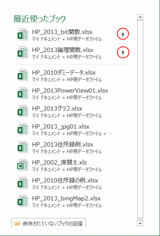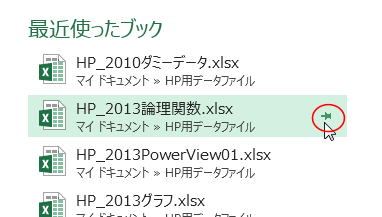 - ファイル名にマウスポインタを重ねると「ピン ボタン」が表示されるので、オンにするとそのファイル(ブック)は常時表示されるようになります。