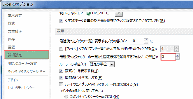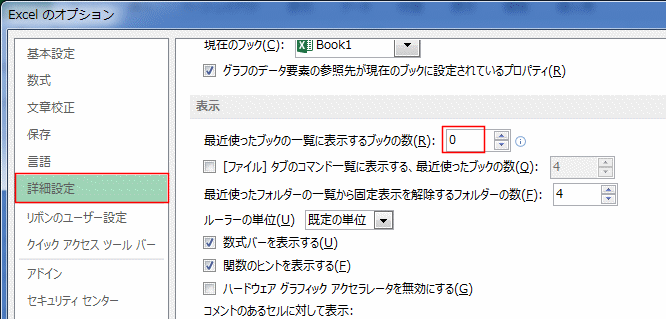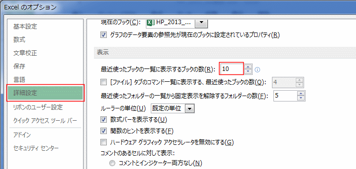 - [詳細設定]を選択し、「最近使ったブックの一覧に表示するブックの数」で設定できます。
