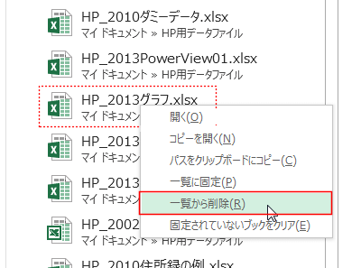 - 一覧から削除するには、ファイル名を右クリックして「一覧から削除」を実行します。