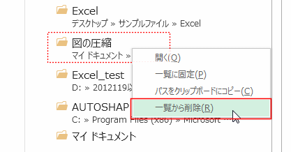- 一覧から削除したいときはフォルダー名を右クリックして「一覧から削除」を実行します。