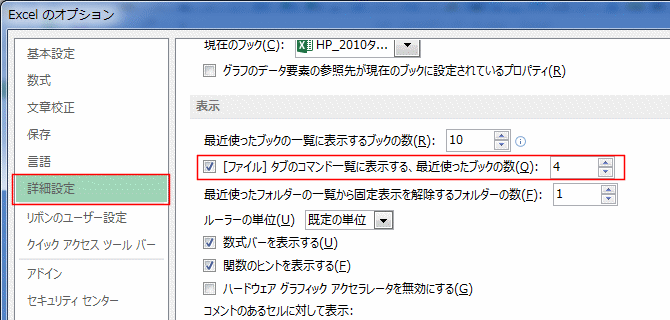 - [詳細設定]を選択し、「[ファイル]タブのコマンド一覧に表示する、最近使ったブックの数」にチェックを入れると、数を設定できます。