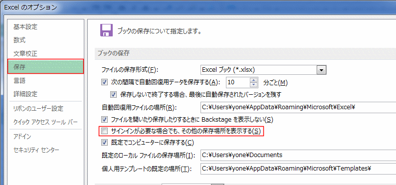 「サインインが必要な場合でも、その他の保存場所を表示する」のチェックを外します。
