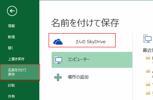 - [名前を付けて保存]を選択すると、「SkyDrive」が表示されません。