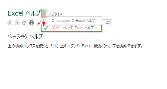 - Excel ヘルプの横の[▼]ボタンをクリックします。「コンピューターの Excel ヘルプ」を選択します。