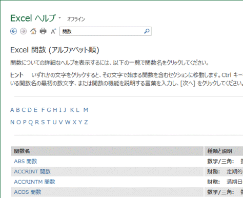 - 「Excel関数(アルファベット順)」を選択すると、下図のような表示になりました。