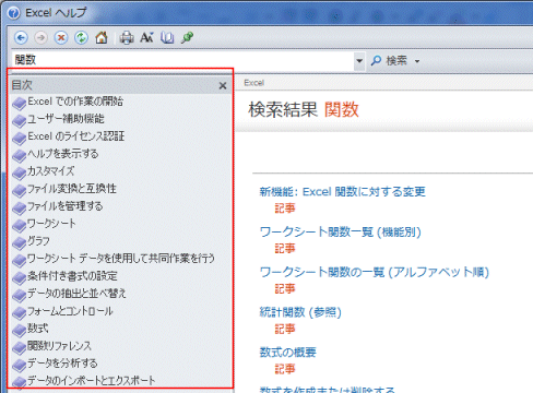 - ちなみに、Excel2010でのオフラインでは下図のように左側に「目次」の作業ウィンドウが表示されていました。
