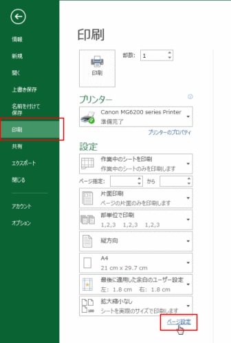- [印刷]を選択し、[ページ設定]をクリックします。