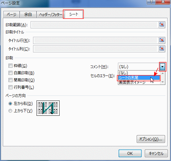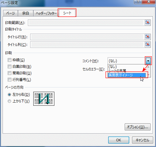 - この設定ではシート上に表示されているコメントは印刷されますが、非表示のコメントは印刷されません。
