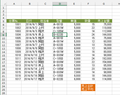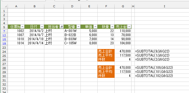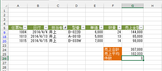 - 担当者で「井上」のデータを表示しました。計算結果が変化したのが分かります。