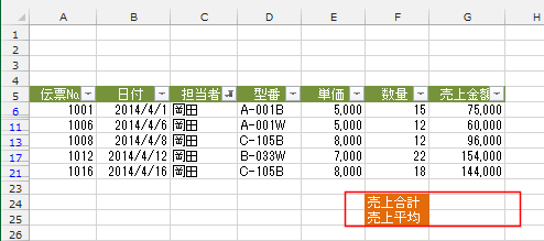 - 担当者で「岡田」のデータを表示しました。正しく表示されたセルの計算が行われているのが分かります。