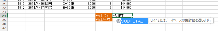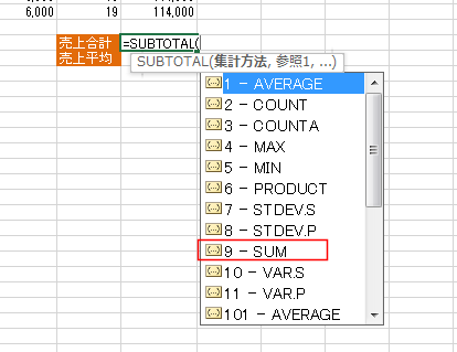SUBTOTAL をダブルクリックすると、 =SUBTOTAL( と入力されます。