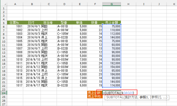 - =SUBTOTAL(101,G6:G22) としてもOKです。