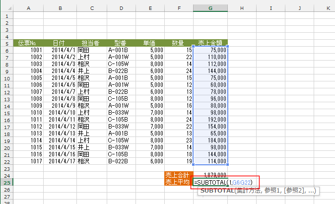 - 同様に、平均は 「 1 - AVERAGE」を利用して、 =SUBTOTAL(1,G6:G22) とします。