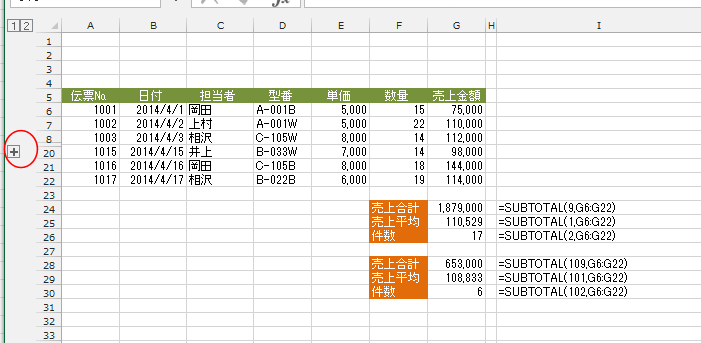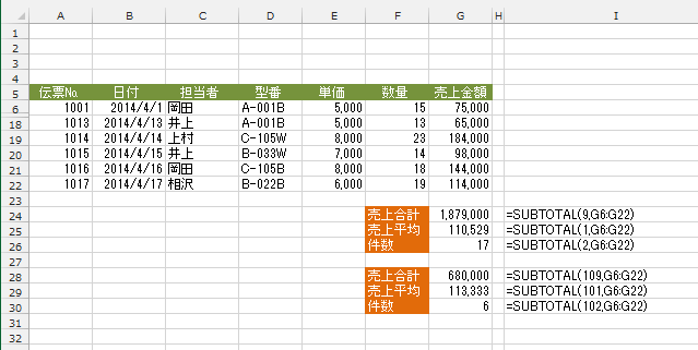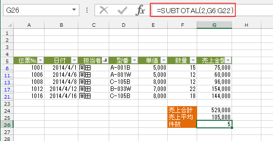 SUBTOTAL関数を使って、合計や平均や件数などを計算をすることができます。