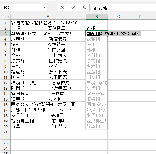 B3セルに「副総理」と文字を変換した時点です。以降はこのようなデータですか?・・・といった感じで、自動で以降のデータが薄く表示されました。