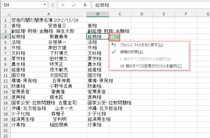 「フラッシュフィルオプション」ボタンが表示されますので、都合が悪いときは取り消す(元に戻す)ことができます。