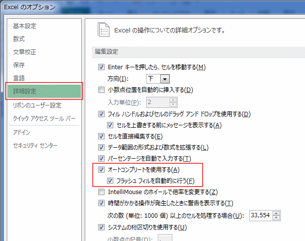 「オートコンプリートを使用する」にチェックを入れ、さらに「フラッシュフィルを自動的に行う」にチェックを入れます。