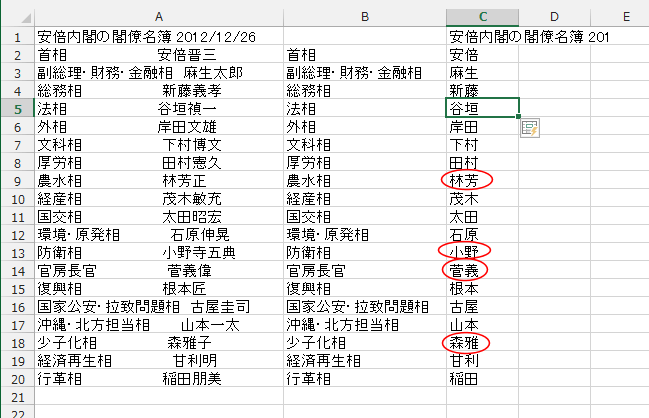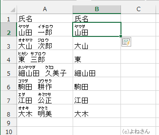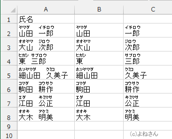 - B,C列に分割されたデータにはふりがなが付いた状態になっています。