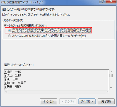 - 「区切り位置指定ウィザード 1/3」で「カンマやタブなどの区切り文字によってフィールドごとに区切られたデータ」にチェックを入れました。