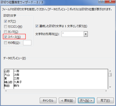- 「区切り位置指定ウィザード 2/3」で「スペース」にチェックを入れました。