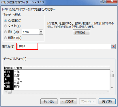 - 「区切り位置指定ウィザード 3/3」で表示先を「B2」としました。
