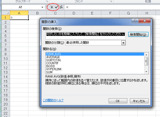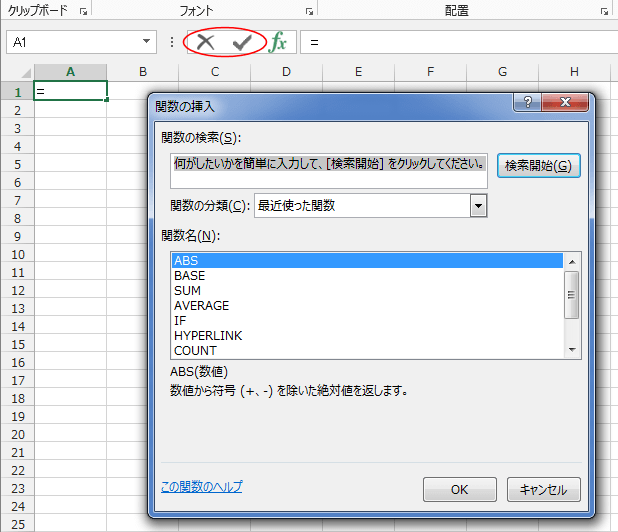 - Excel2013では関数の挿入ボタンの横にキャンセルボタンと決定ボタンが表示されています。