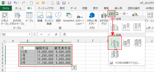 よねさんのExcelとWordの使い方|エクセル2013基本講座:目次|グラフの使い方|3-D集合縦棒グラフを作成する