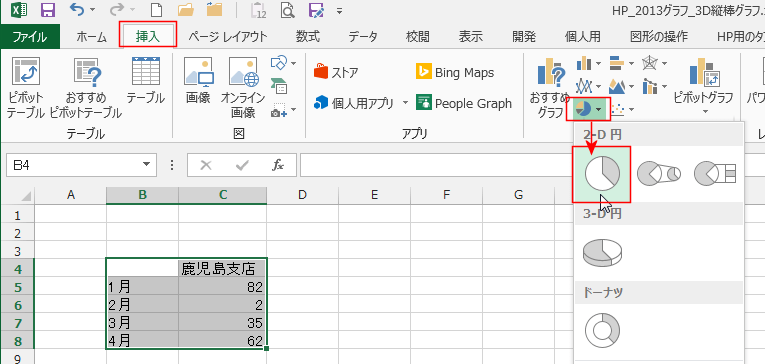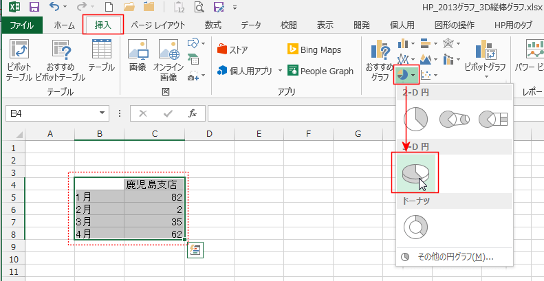 - セル範囲B4:C8を選択して、[挿入]タブの[円またはドーナツグラフの挿入]→[3-D円]を実行します。