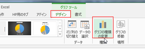 - 円グラフを選択して、グラフツールのデザインタブで[グラフの種類の変更]を実行します。