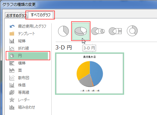 - 作成済みの円グラフを3-D円グラフに変更します。