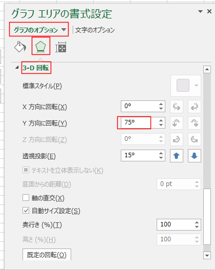 - グラフエリアをダブルクリックして、グラフエリアの書式設定で3-D回転のY方向に回転が「75°」になっているためです。