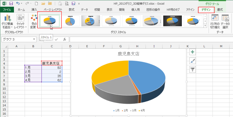 - または、グラフツールのデザインタブを選択して、グラフのスタイルで「スタイル1」を選択して、上記と同じ3-D円グラフにすることができます。