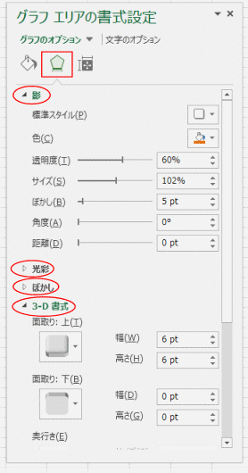- 「グラフエリアの書式設定」の[効果」をクリックすると、「影」「光彩」「ぼかし」「3-D書式」の設定ができます。