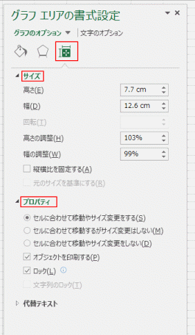 - 「グラフエリアの書式設定」の[サイズとプロパティ」をクリックすると、「サイズ」「プロパティ」の設定ができます。