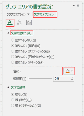 - 「グラフエリアの書式設定」の[文字のオプション」をクリックすると、「文字の塗りつぶしと輪郭」「文字の効果」の設定ができます。