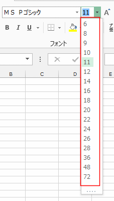 - このショートカットキーで設定されるフォントサイズは、フォントサイズのドロップダウンリストで表示されるサイズの順番で変化します。