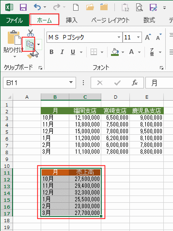 - 付け加えたいデータを選択して[ホーム]タブの[コピー]を実行します。