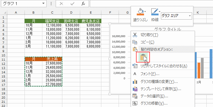 - グラフエリアを右クリックして、[貼り付け]を実行します。
